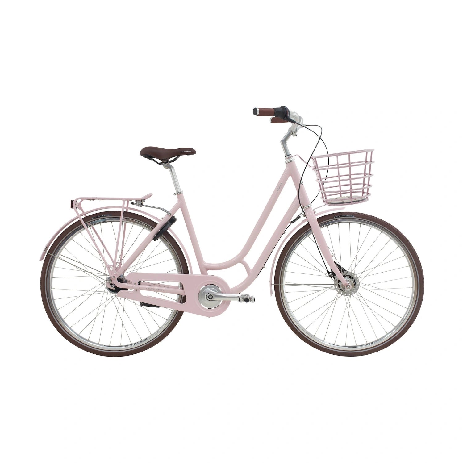 Centurion Aura laves kun i "dame" stel med lav indstigning, så cyklen er let at komme af og på. Cyklen fås her i en blank pink / lyserød farve. For at opretholde et retro-design, er dæk, sadel og håndtag i brun. Aura er designet med et M-formet shoppingstyr med vintage detaljer, hvilket giver en ret siddestilling.