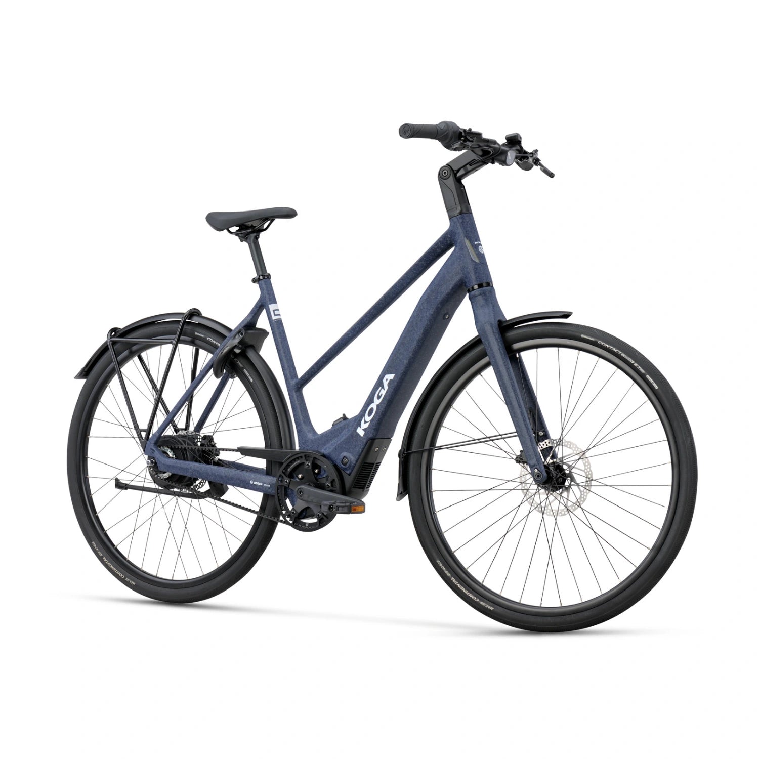 Denne udgave af Koga E-Supermetro er i dame stel med semi-lav indstigning, så cyklen er lettere at stige af og på. Dame-udgaven fås her i Wrinkle Jeans, som er en matblå farve. Cyklen har et super fedt look på grund af brugen af KOGA Crown Connect teknologi, hvor lygter, forgaffel og lyskabler er perfekt integreret. Kablet til lygterne løber gennem forgaffel, stel og sadelpind.
