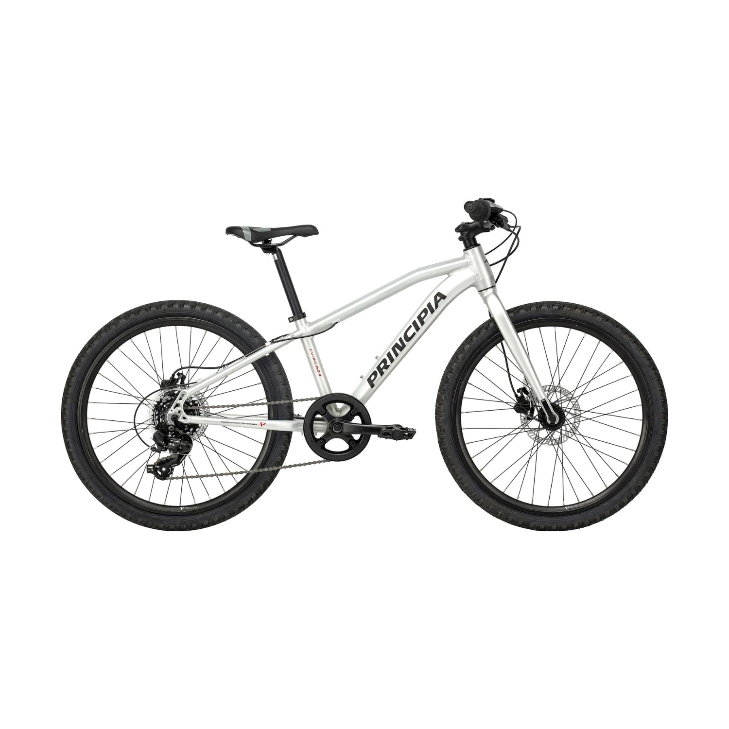 Principia Evoke A2.4 børne mountainbike i blank sølv med 24" hjul. Denne variant er med fast forgaffel.