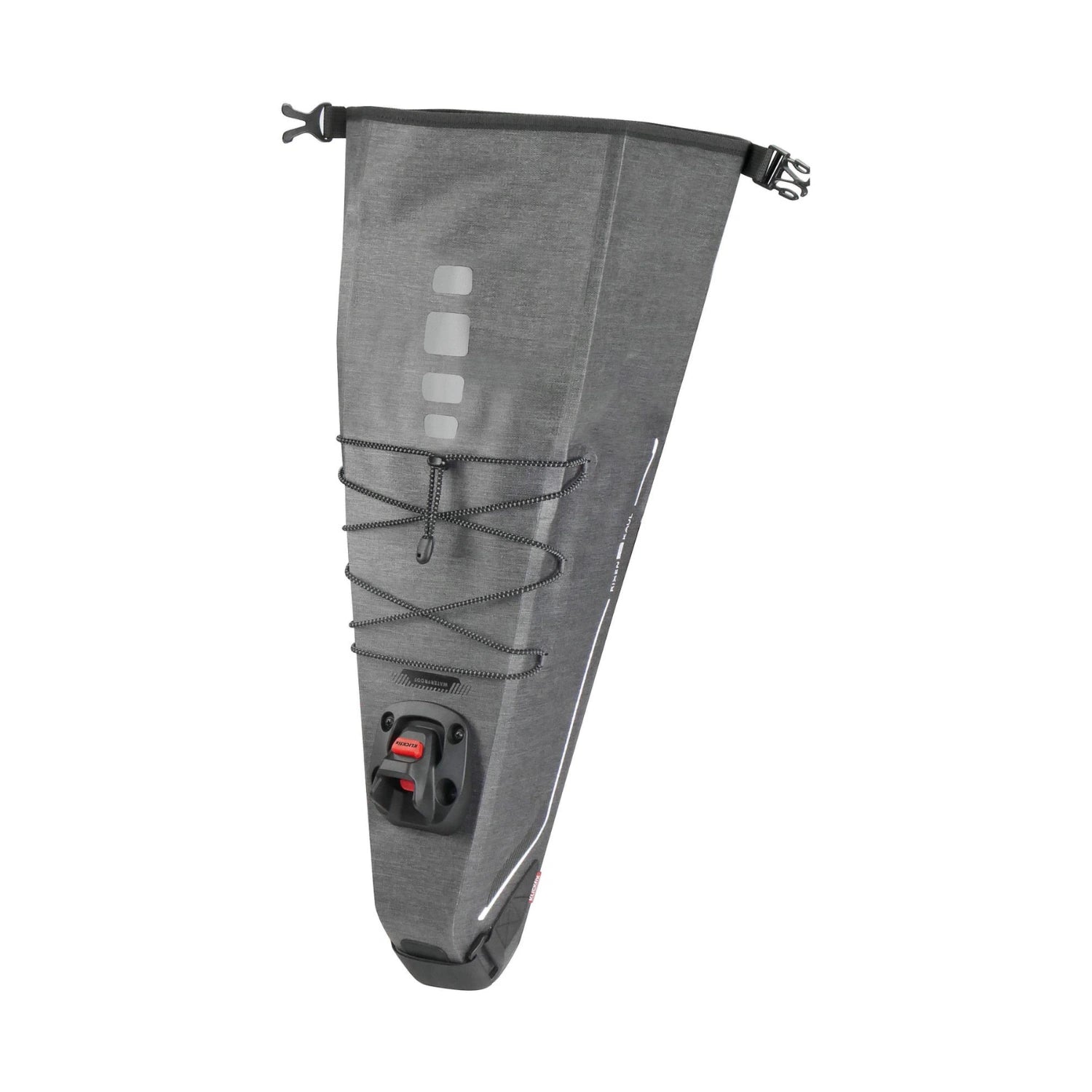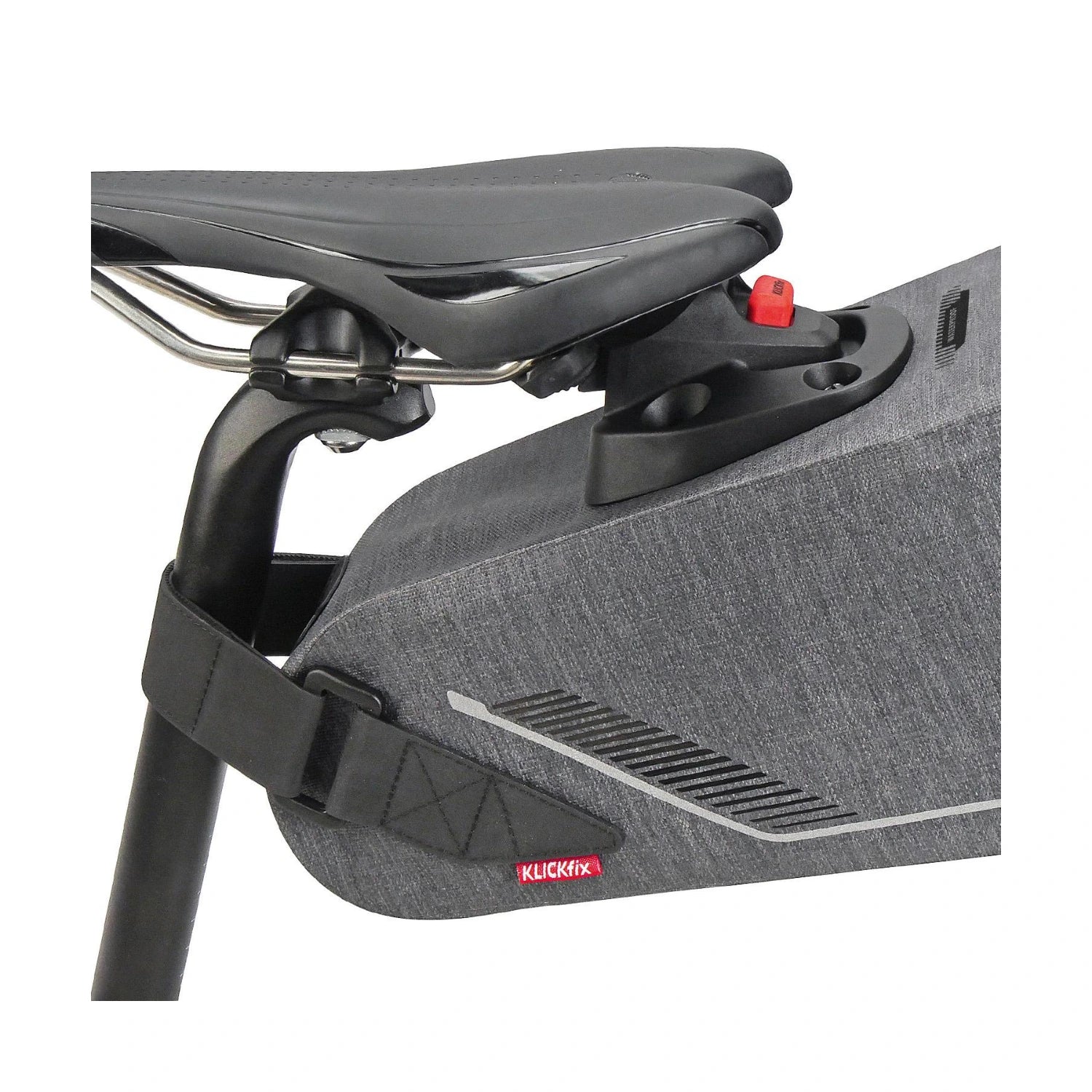 KlickFix Bikepack X er en vandtæt sadeltaske, som her fås i grå. Denne smarte sadeltaske kan monteres og fjernes lynhurtigt uden at skulle spænde utallige stropper. Bikepack X klikkes blot på KlickFix Contour sadeladapteren (inkl. i prisen), mens velcro-løkken fastgøres omkring sadelpinden. Herefter sidder tasken stabilt uden at svinge ud til siderne eller op og ned.